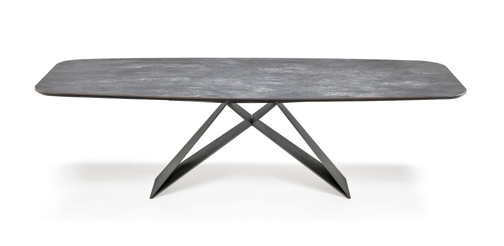 Стол с базой из стали, окрашенной в титан (GFM11), черный (GFM73) или графитовый (GFM69). Топ из керамики под мрамор, цветов: Calacatta (KM01), Alabastro (KM02), Ardesia (KM04), матовая Golden Calacatta (KM05), глянцевая Golden Calacatta (KM06), матовая Portoro (KM07), глянцевая Portoro (KM08), глянцевая Sahara Noir (KM09) или Brown Zinc (KZ01).