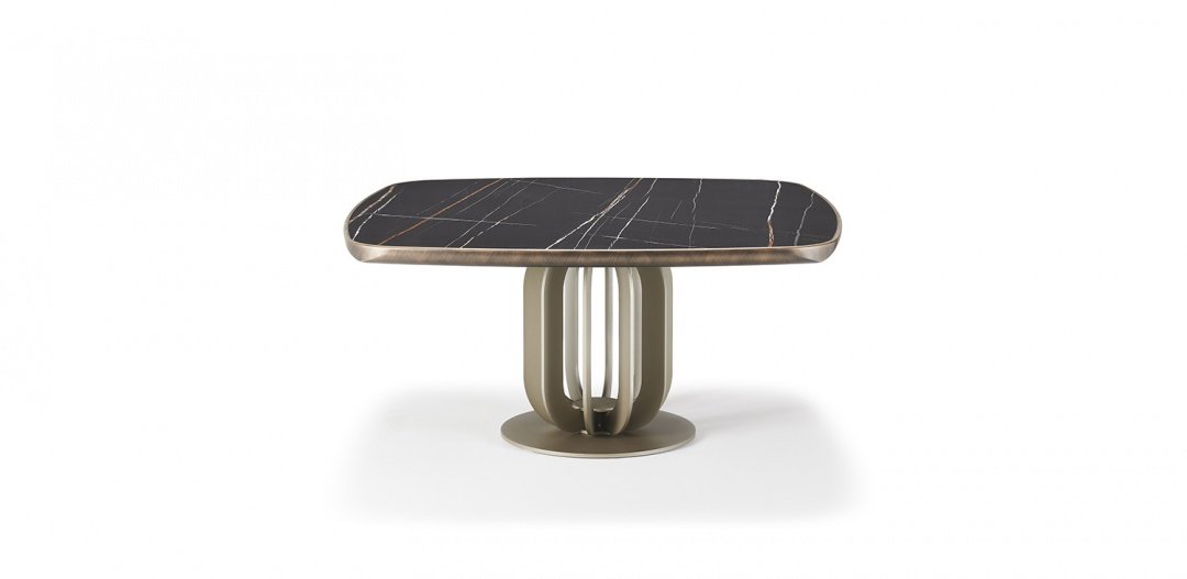 Стол с базой из стали окрашенной в гофрированный титан (GFM11), графит (GFM69) или черный (GFM73). Топ из керамики цветов Calacatta (KM01), Alabastro (KM02), Ardesia (KM04), Golden Calacatta opaco (KM05), Golden Calacatta lucido (KM06), Portoro opaco (KM07), Portoro lucido (KM08), Sahara Noir lucido (KM09), Emperador (KM10) или Makalu (KM11) с нижним закругленным профилем окрашенным в черный или брашированную бронзу. Топ имеет толщину 6 см.