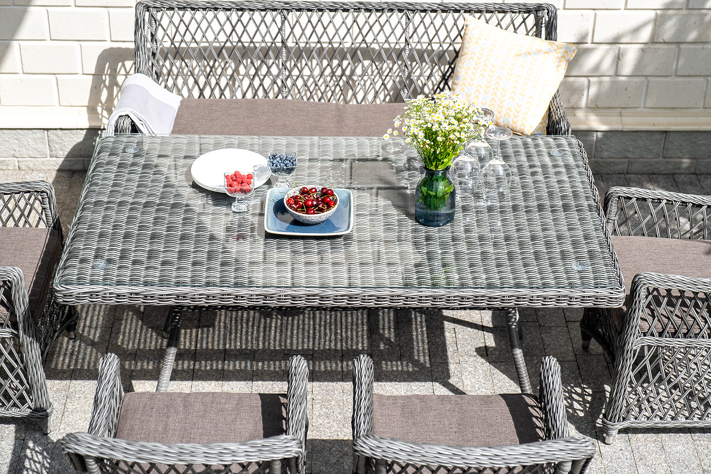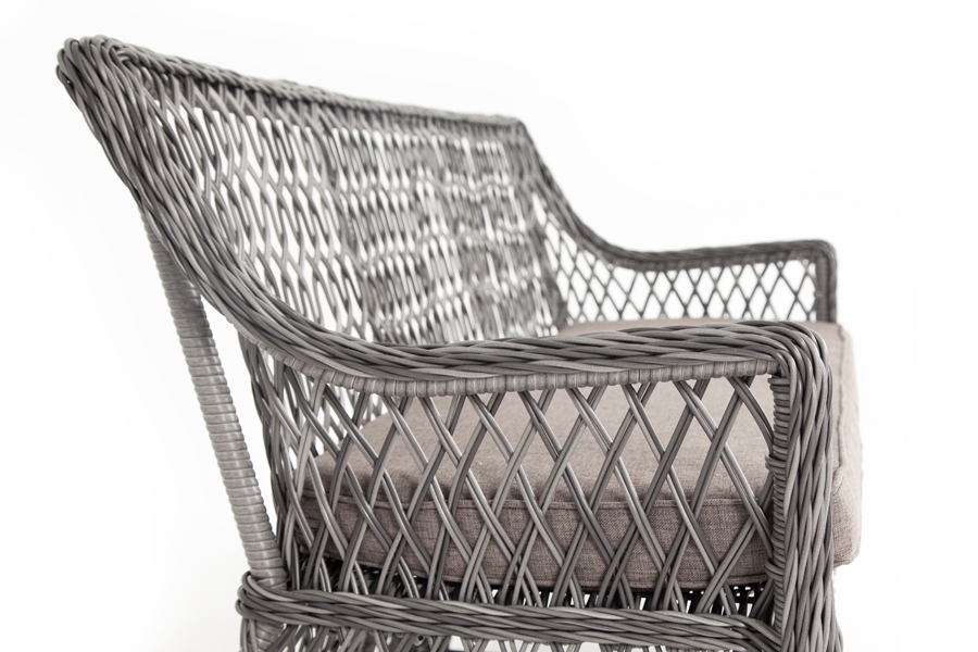 Каркас выполнен из алюминия, выдерживающий до 200 кг. Сверху все вручную оплетено круглым искусственным ротангом высокого качества. Цвет - "графит". Под солнечным светом изящное плетение приобретает более насыщенный тон.