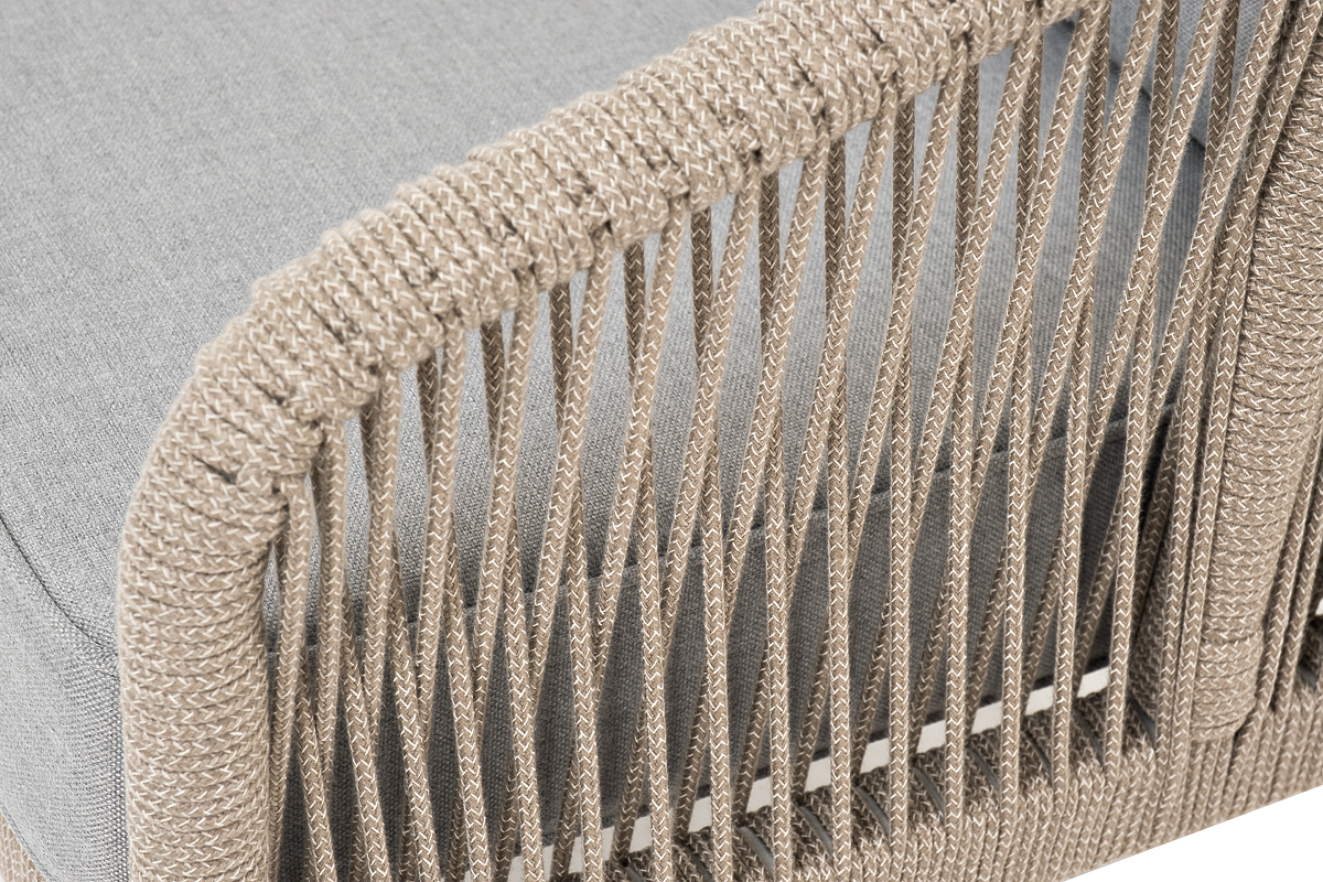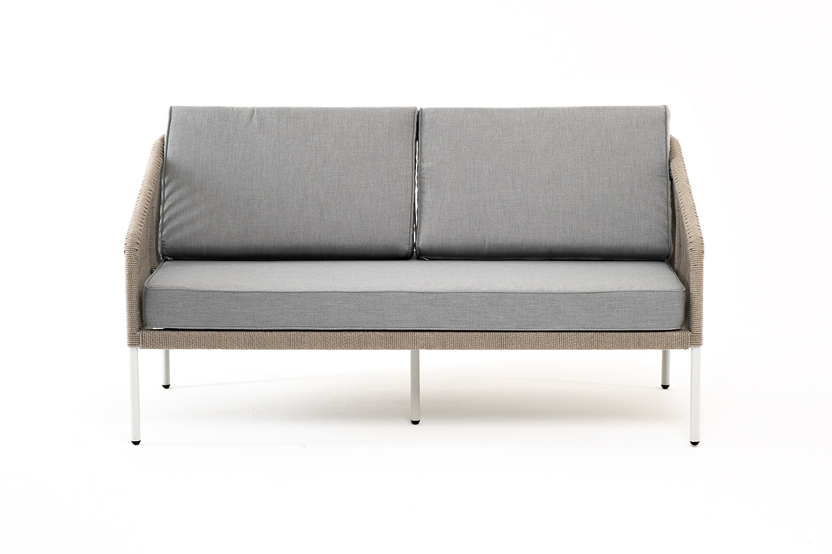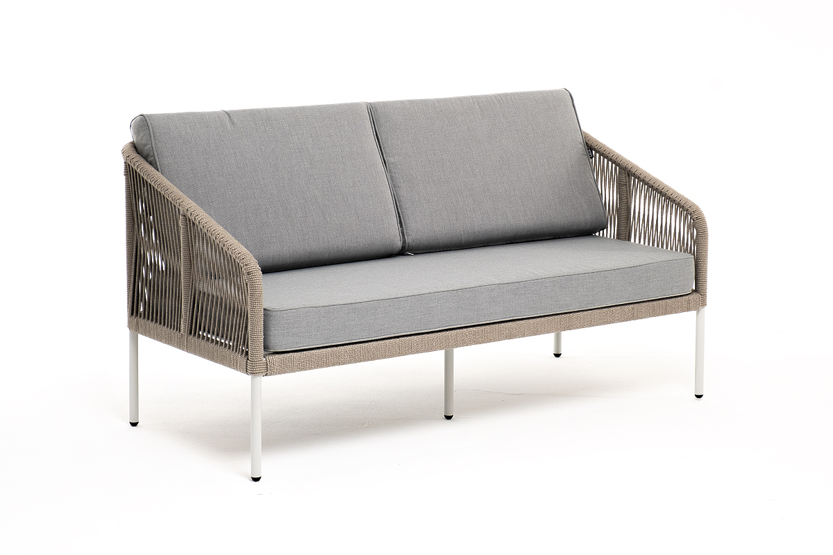 "Канны" диван 2-местный плетеный из роупа, каркас алюминий светло-серый (RAL7035) муар, роуп серый меланж круглый, ткань светло-серая