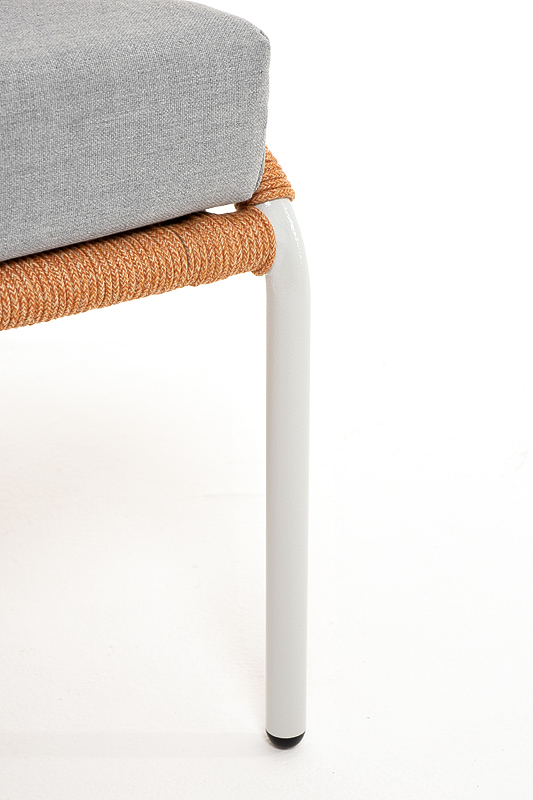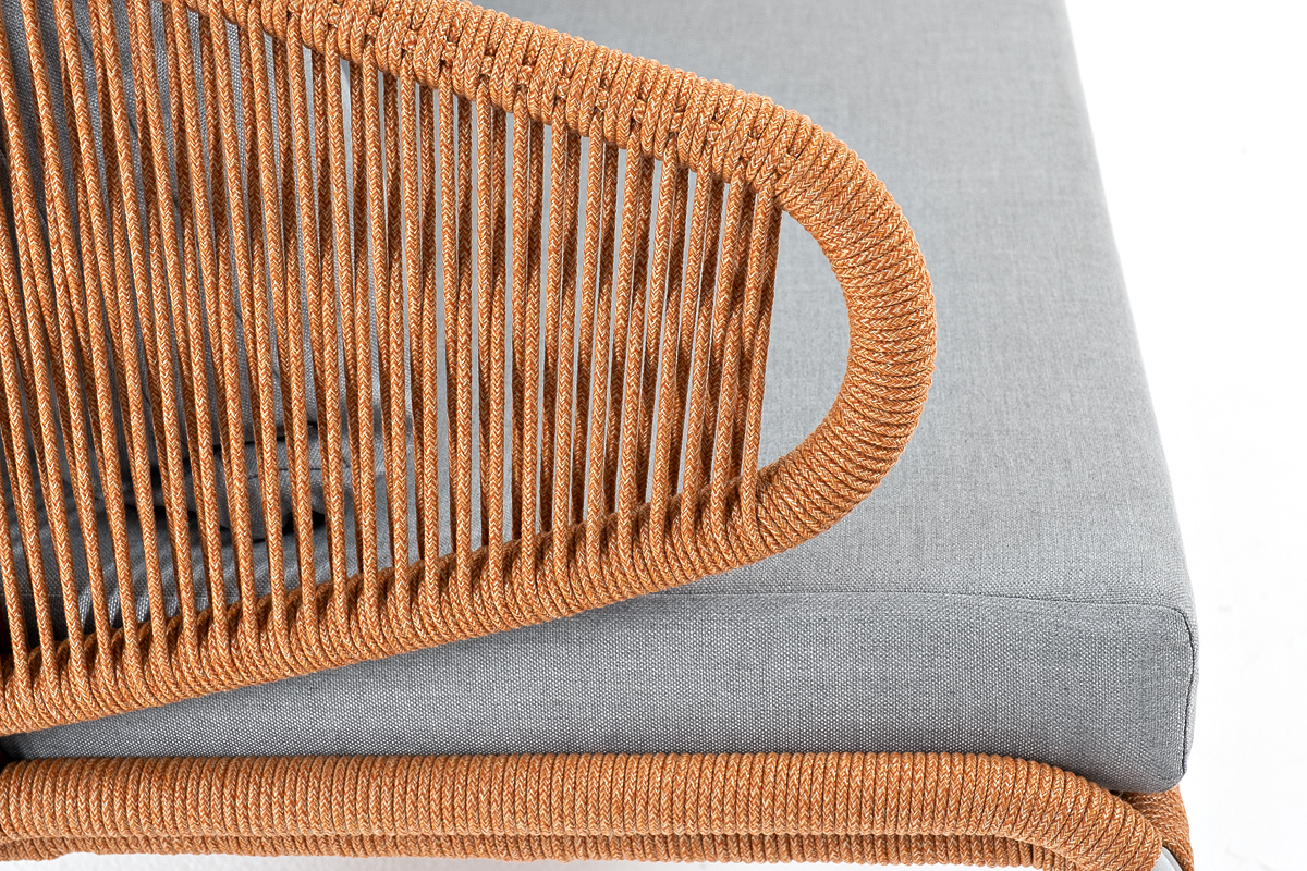 Диван имеет алюминиевый каркас, окрашенный порошковой краской в светло-серый (RAL7035) цвет. Боковины каркаса и спинка вручную оплетены роупом - эластичными синтетическими лентами, изготовленными из высокопрочных полиэфирных волокон. Цвет оплетки – оранжевый меланж.
